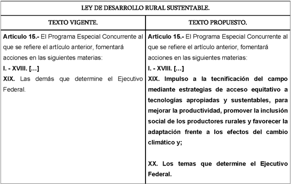 Por ello, se propone esta reforma, a fin de adicionar una fracción que establezca con claridad la tecnificación del campo como una línea de acción prioritaria en las políticas públicas de desarrollo rural. Esta modificación permitirá que la planeación, y la acción gubernamental consideren a la modernización tecnológica del campo como una herramienta clave para alcanzar una agricultura más justa, eficiente y sustentable, por lo que se propone iniciativa con proyecto de: