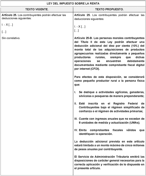 En este sentido, se propone reformar la Ley del Impuesto Sobre la Renta para permitir que las personas morales deduzcan, adicionalmente al monto ordinario, un 10 por ciento del valor total de las adquisiciones realizadas directamente a pequeños productores rurales. Por lo anterior es necesario reformar el articulo 25 de la Ley del Impuesto Sobre la Renta, representado en el siguiente cuadro comparativo de la siguiente manera, para mayor claridad: