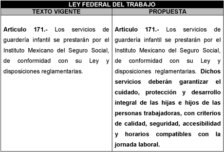 Por lo tanto, se vuelve indispensable robustecer el artículo 171 de la Ley Federal del Trabajo para reconocer en la prestación de guarderías un derecho laboral pleno, que atienda simultáneamente a la protección de la maternidad, a la igualdad entre mujeres y hombres, al interés superior de la niñez y al deber del Estado de apoyar a las familias mexicanas en todas sus etapas y condiciones de vida.
