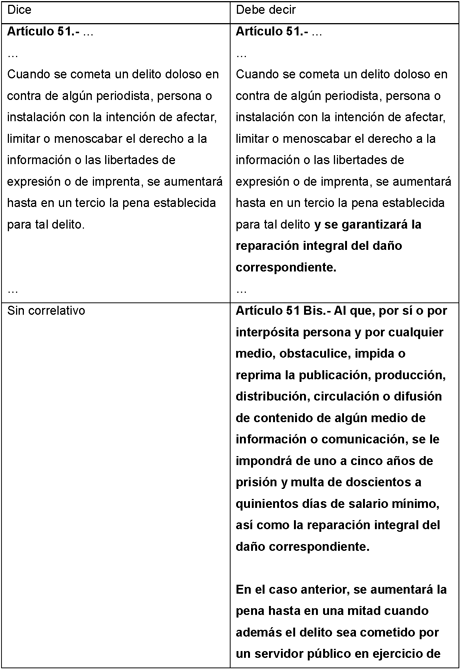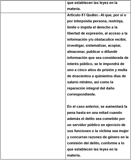 Artículo 51 Quáter. Al que, por sí o por interpósita persona, restrinja, limite o impida el derecho a la libertad de expresión, al acceso a la información y/u obstaculice recibir, investigar, sistematizar, acopiar, almacenar, publicar o difundir información que sea considerada de interés público, se le impondrá de uno a cinco años de prisión y multa de doscientos a quinientos días de salario mínimo, así como la reparación integral del daño correspondiente.