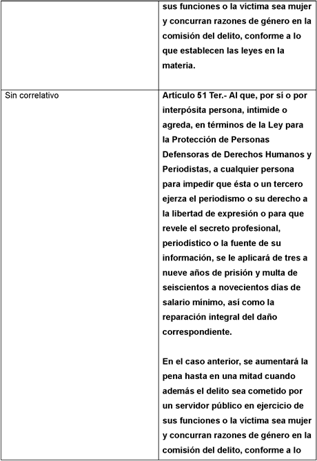 Artículo 51 Ter. Al que, por sí o por interpósita persona, intimide o agreda, en términos de la Ley para la Protección de Personas Defensoras de Derechos Humanos y Periodistas, a cualquier persona para impedir que ésta o un tercero ejerza el periodismo o su derecho a la libertad de expresión o para que revele el secreto profesional, periodístico o la fuente de su información, se le aplicará de tres a nueve años de prisión y multa de seiscientos a novecientos días de salario mínimo, así como la reparación integral del daño correspondiente.