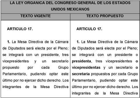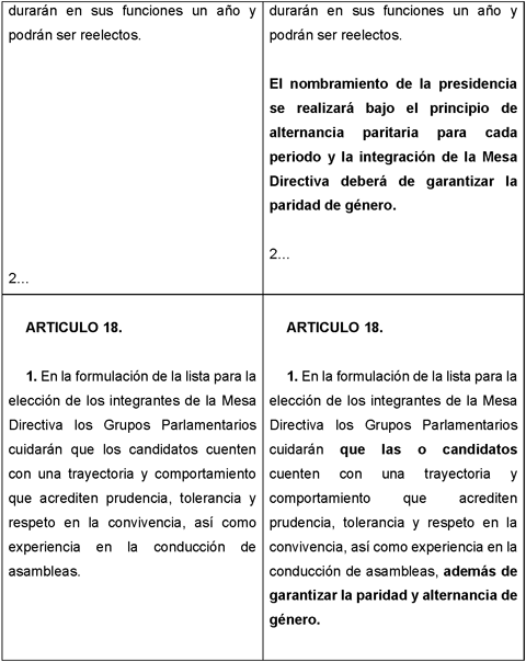 En ese tenor, resulta necesario incorporar e integrar la equidad de género para la integración de la Mesa Directiva y la alternancia en la designación de la titularidad de quien encabezará la Presidencia de la misma, con lo que se garantizará la igualdad de género en el órgano de dirección legislativo y el criterio de alternancia para la conducción de los trabajos parlamentarios, con lo cual se da respuesta a la exigencia de la participación equilibrada de las mujeres y hombres, que está plasmada en instrumentos internacionales, en consensos y en la agenda global general.