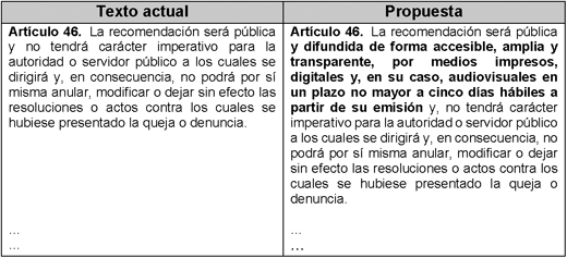 Artículo 46. La recomendación será pública y difundida de forma accesible, amplia y transparente, por medios impresos, digitales y, en su caso, audiovisuales en un plazo no mayor a cinco días hábiles a partir de su emisión y, no tendrá carácter imperativo para la autoridad o servidor público a los cuales se dirigirá y, en consecuencia, no podrá por sí misma anular, modificar o dejar sin efecto las resoluciones o actos contra los cuales se hubiese presentado la queja o denuncia.