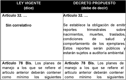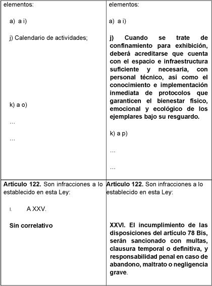 En tal virtud, se presenta la siguiente iniciativa con proyecto de decreto, por el que se reforman los artículos 32 y 122 Ley General de Vida Silvestre y se adicionan el inciso j), con lo que se recorre el orden de los subsecuentes, al artículo 78 de la Ley General de Vida Silvestre, la fracción XXIV al artículo 6 y un segundo párrafo al artículo 11 a la Ley Federal de Sanidad Animal, en materia de protección de fauna en cautiverio y supervisión de zoológicos, para quedar como sigue: