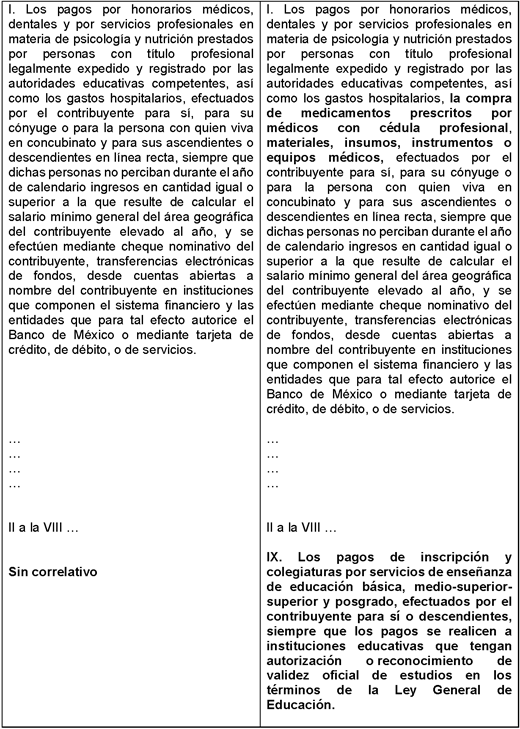 Actualmente, la Ley de Impuesto sobre la Renta establece que honorarios médicos, dentales, de psicología y nutrición, así como los servicios de enfermería, análisis clínicos, prótesis, hospitalización y algunos seguros de gastos médicos son gastos que pueden ser deducibles de impuestos, permitiendo a las familias mexicanas hacer frente a los problemas de salud, sin embargo, en el caso específico de los medicamentos, materiales, insumos e instrumentos o equipo médico no existe una limitante que afecta directamente a esta deducción, pues estos solo son deducibles cuando aparecen en la factura de un hospital, es decir, cuando forman parte de un servicio hospitalario. En cambio, los medicamentos, materiales, insumos e instrumentos o equipo médico adquiridos en farmacias, que hoy en día son adquiridos más cuando no son proporcionados en las instituciones de salud públicas para la debida atención de los pacientes, aunque se cuente con receta médica y factura no son deducibles de ISR.