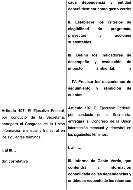 Se plantea que cada dependencia y entidad del Ejecutivo Federal etiquete un porcentaje de su gasto programable en acciones sustentables , y que dichas erogaciones se reporten en el Presupuesto de Egresos y en la Cuenta Pública mediante un Informe de Gasto Verde , sujeto a evaluación de resultados. Con ello se busca:
