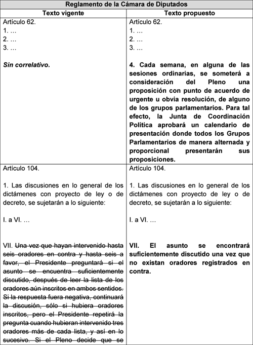 En suma, las reformas que aquí se plantean buscan fortalecer a la Cámara de Diputados como un órgano plural y deliberativo, en el que tanto mayorías como minorías tengan garantizado un acceso a los mecanismos de participación parlamentaria. La incorporación de iniciativas preferentes para los grupos, la garantía de que ningún debate se clausure sin la intervención de todas las voces críticas, y la inclusión periódica, plural y proporcional de proposiciones de urgente y obvia resolución en el Pleno, representan pasos concretos hacia una democracia parlamentaria más equilibrada y representativa.