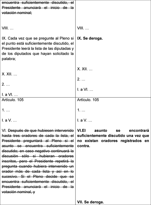 Se propone establecer que la conclusión de alguna discusión en el Pleno ocurrirá cuando no existan oradores registrados en contra. Esta disposición busca enriquecer el debate parlamentario, evitando que el cierre del debate dependa únicamente de la fuerza mayoritaria. Con ello se asegura que todas las posturas puedan ser escuchadas, especialmente aquellas que expresen visiones críticas o disidentes sobre un asunto.