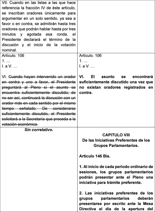Artículo Único. Se reforman las fracciones VII del artículo 104, la VI del artículo 105, la VI del artículo 106, y se derogan las fracciones IX del artículo 104 y la fracción VII del artículo 105; se adiciona un numeral 4 al artículo 62, un Capítulo VIII al Título Cuarto del Reglamento de la Cámara de Diputados, denominado De las Iniciativas preferentes de los Grupos Parlamentarios, y un artículo 146 Bis, para quedar como sigue: