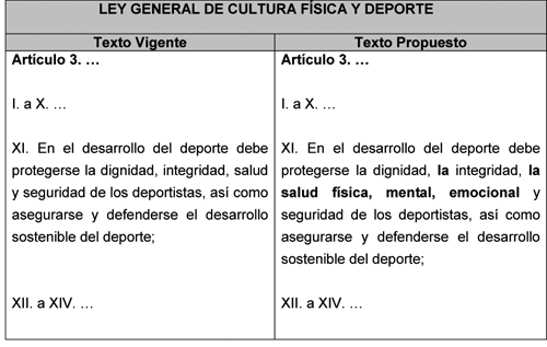 Es en este sentido, que la presente iniciativa contribuirá a que en el ejercicio y desarrollo del derecho a la cultura física y el deporte, también se deba proteger la salud física, mental y emocional de los deportistas, con el objetivo de obtener una salud integral para el pleno goce de la práctica deportiva.