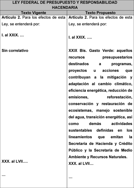 XXIX Bis. Gasto verde: aquellos recursos presupuestarios destinados a programas, proyectos u acciones que contribuyan a la mitigación y adaptación al cambio climático, eficiencia energética, reducción de emisiones, reforestación, conservación y restauración de ecosistemas, manejo sostenible del agua, transición energética, así como demás actividades sustentables definidas en los lineamientos que emitan la Secretaría de Hacienda y Crédito Público y la Secretaría de Medio Ambiente y Recursos Naturales.