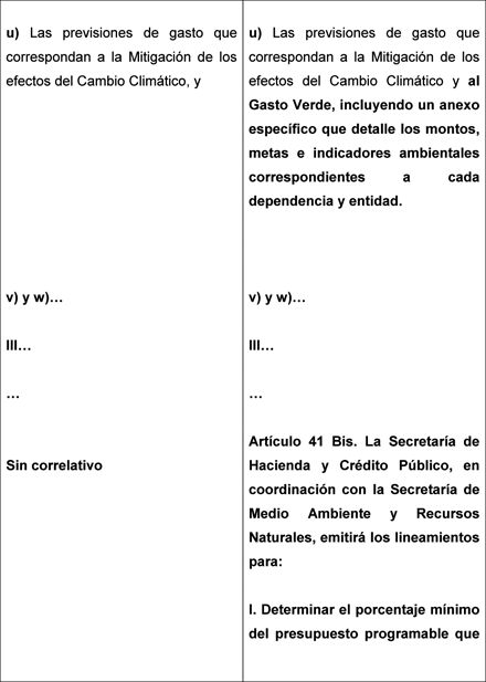 u) Las previsiones de gasto que correspondan a la Mitigación de los efectos del Cambio Climático y al Gasto Verde, incluyendo un anexo específico que detalle los montos, metas e indicadores ambientales correspondientes a cada dependencia y entidad.