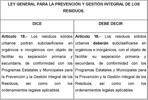 Ahora bien, la Ley General para la Prevención y Gestión Integral de los Residuos (LGPGIR), en su artículo 10, establece que los municipios tienen a su cargo las funciones de manejo integral de los residuos sólidos urbanos, que comprenden la recolección, traslado, tratamiento y disposición final. Asimismo, el artículo 18 de la misma ley establece actualmente que los residuos sólidos urbanos podrán subclasificarse en orgánicos e inorgánicos con objeto de facilitar su separación primaria y secundaria, de conformidad con los programas estatales y municipales para la prevención y gestión integral de los residuos. Sin embargo, al tratarse de una disposición facultativa y no obligatoria, su aplicación ha sido desigual y limitada en el territorio nacional. Por ello, esta iniciativa propone elevar dicha disposición a carácter obligatorio, a fin de garantizar que en todo el país se realice la separación de residuos en origen, promoviendo así una gestión más eficiente, sustentable y armónica entre los tres órdenes de gobierno.