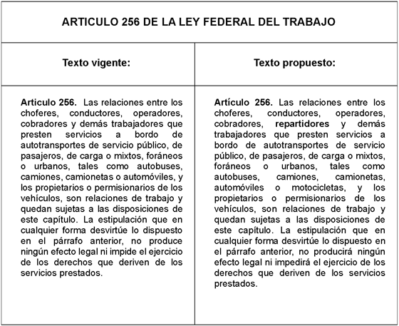 Asimismo, es indispensable actualizar el artículo 256 de esta ley, para incluir a los repartidores como sujetos regulados en el capítulo relativo al trabajo de autotransporte, dado el crecimiento exponencial de esta actividad en los últimos años y la falta de un marco jurídico que garantice seguridad laboral y acceso a la seguridad social.