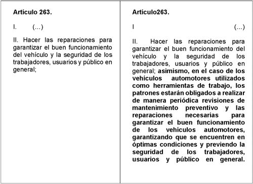 De igual forma, el artículo 263 del mismo marco, debe establecer como obligación patronal la realización de revisiones de mantenimiento preventivo y correctivo, a fin de que los vehículos se encuentren siempre en condiciones óptimas para la seguridad de trabajadores, usuarios y del público en general.