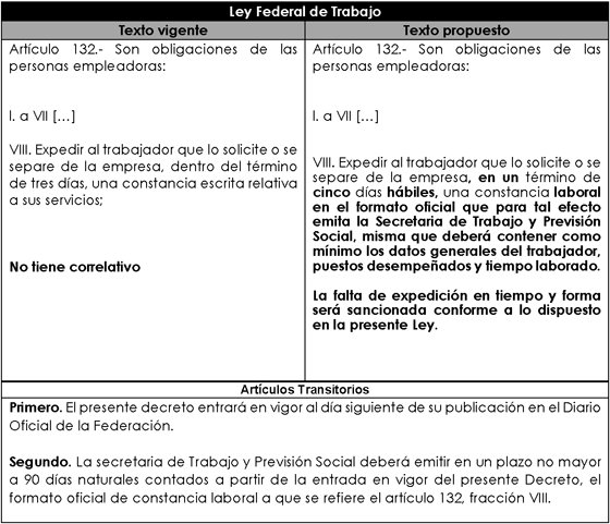 Segundo. La Secretaría de Trabajo y Previsión Social deberá emitir en un plazo no mayor a 90 días naturales contados a partir de la entrada en vigor del presente decreto, el formato oficial de constancia laboral a que se refiere el artículo 132, fracción VIII.
