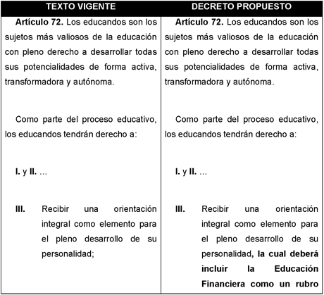 La reforma que se propone mediante la modificación de la fracción III del artículo 72 de la Ley General de Educación reconoce que la orientación integral del educando debe incluir, de manera expresa y obligatoria, la educación financiera como un componente transdisciplinario.