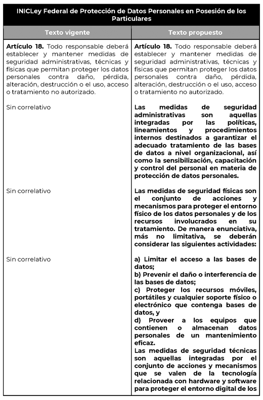 Esta ley surgió como una respuesta a la creciente digitalización y al uso masivo de información en sectores como el comercio, la banca, los servicios médicos y tecnológicos. Sin embargo, el artículo 18 de la ley, en su redacción actual, carece de definiciones claras sobre qué deben entenderse como medidas de seguridad administrativas, físicas y técnicas, lo que deja un margen de interpretación que puede derivar en prácticas inadecuadas y en una protección insuficiente para los titulares de los datos.