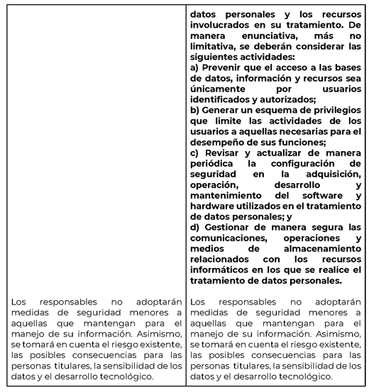 Los responsables no adoptarán medidas de seguridad menores a aquellas que mantengan para el manejo de su información. Asimismo, se tomará en cuenta el riesgo existente, las posibles consecuencias para las personas titulares, la sensibilidad de los datos y el desarrollo tecnológico.