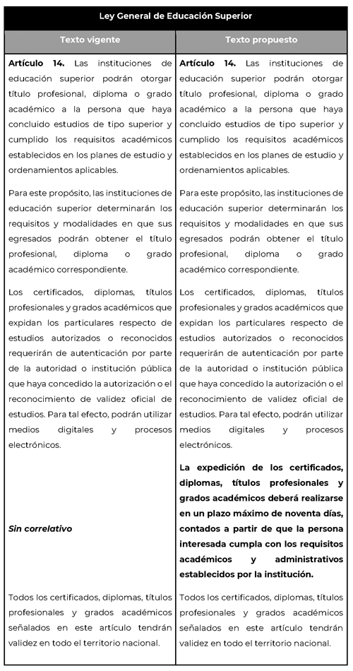 Por lo anterior, se propone modificar el artículo 14 de la Ley General de Educación Superior, de acuerdo con la siguiente:
