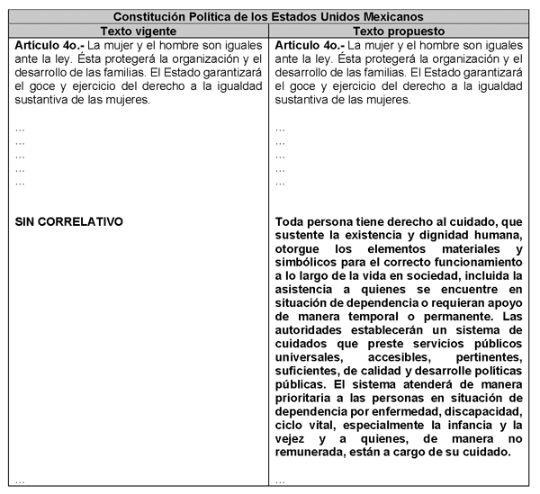 Sobresale que fue en el año 2017 cuando se dio la reforma del anterior artículo lo que marca el avance de la legislación mexicana y que exige hoy en 2025, alinear el marco jurídico más importante del país; la Constitución Política de los Estados Unidos Mexicanos; si bien existen leyes secundarias que contemplan rastros de la atribución por mencionar algunas, como la Ley de los Derechos de las Personas Adultas Mayores, en sus artículos 5, 6, 7, 8 y especialmente 9; la Ley General de los Derechos de Niñas, Niños y Adolescentes en sus artículos 10, 11 y 13; sigue siendo insuficiente, pues el derecho al cuidado como garantía no existe.