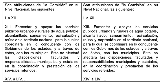 Por lo anterior y con la finalidad de aportar a las alternativas de fortalecimiento para el acceso al agua se proponen adiciones a la Ley de Aguas Nacionales cuyo propósito es establecer el concepto de captación de agua pluvial, como una de las principales soluciones a la escasez del líquido, resaltando que la Ley General del Equilibrio Ecológico y la Protección al Ambiente en su artículo 17 Ter, párrafo tercero, contempla la definición de agua pluvial, siendo menester incluirse en la ley secundaria principal del agua. Asimismo, se busca otorgar a la Comisión Nacional del Agua la atribución de fomentar en los servicios públicos urbanos y rurales de agua potable la captación de la misma, en coordinación con los gobiernos estatales y estos, a su vez, con los municipios.