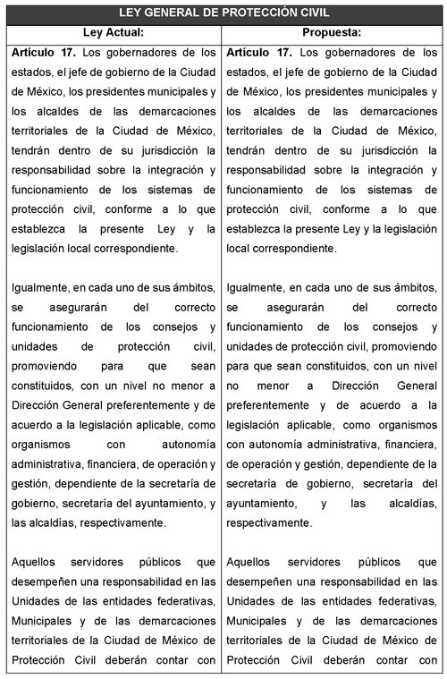 Artículo Único. Por el que se adiciona un párrafo cuarto, al artículo 17, corriéndose en su orden el actual párrafo cuarto, para pasar a ser párrafo quinto y así sucesivamente y se reforma el artículo 48 de la Ley General de Protección Civil, para quedar como sigue:
