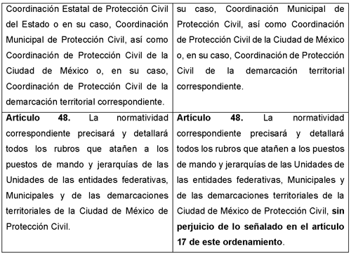 Artículo 48. La normatividad correspondiente precisará y detallará todos los rubros que atañen a los puestos de mando y jerarquías de las Unidades de las entidades federativas, municipales y de las demarcaciones territoriales de la Ciudad de México de Protección Civil, sin perjuicio de lo señalado en el artículo 17 de este ordenamiento.