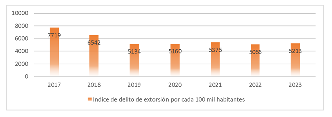 En México el delito de extorsión es muy común y cada vez más frecuente.1 En 2024 la tasa de prevalencia delictiva fue de 23 mil 323 víctimas por cada 100 mil habitantes, cifra superior respecto a 2022, la extorsión se ubica en 5 mil 213 por cada 100 mil habitantes.2