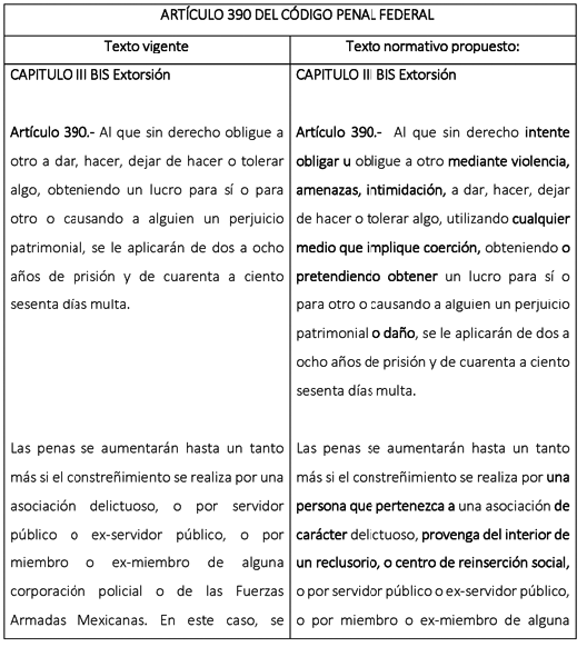 El tipo penal consagrado en el artículo 390 del Código Penal Federal fue creado en 1984; la última reforma data de 1994 y desde ese año a la fecha dicho delito ha quedado obsoleto en contraste con la realidad que hoy vivimos, los contextos han cambiado y la actividad criminal se ha diversificado, encontrando otras vías para hacerse de recursos a través de actividades ilícitas, desatando la inseguridad en el país.