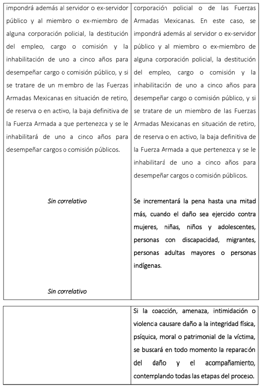 Las penas se aumentarán hasta un tanto más si el constreñimiento se realiza por una persona que pertenezca a una asociación de carácter delictuoso, provenga del interior de un reclusorio o centro de reinserción social , o por servidor público o exservidor público, o por miembro o exmiembro de alguna corporación policial o de las Fuerzas Armadas Mexicanas. En este caso, se impondrá además al servidor o exservidor público y al miembro o exmiembro de alguna corporación policial, la destitución del empleo, cargo o comisión y la inhabilitación de uno a cinco años para desempeñar cargo o comisión público, y si se tratare de un miembro de las Fuerzas Armadas Mexicanas en situación de retiro, de reserva o en activo, la baja definitiva de la Fuerza Armada.