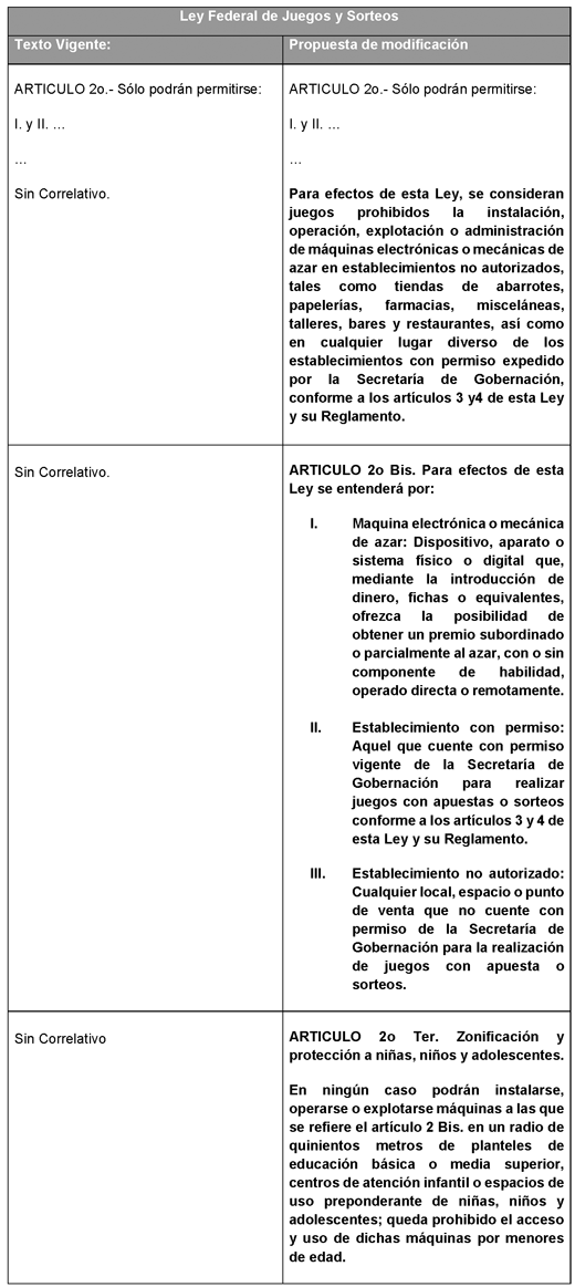 Para una fácil comprensión de la iniciativa, se presenta la siguiente tabla comparativa en la que se aprecia en la primera columna el texto vigente y en la segunda columna la propuesta de modificación: