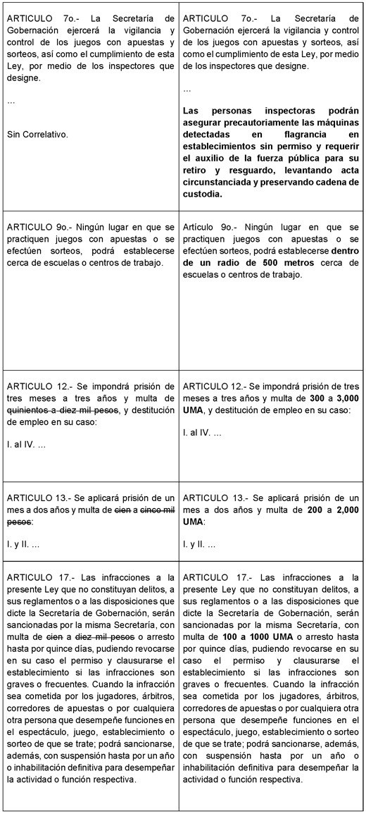 Primero. Se adiciona un tercer párrafo al artículo 2o.; un artículo 2o. Bis, un artículo 2o. Ter, un tercer párrafo al artículo 7o., y se reforma el artículo 9o.; el primer párrafo del artículo 12, el primer párrafo del artículo 13, y el artículo 17, todos a la Ley Federal de Juegos y Sorteos, para quedar como sigue: