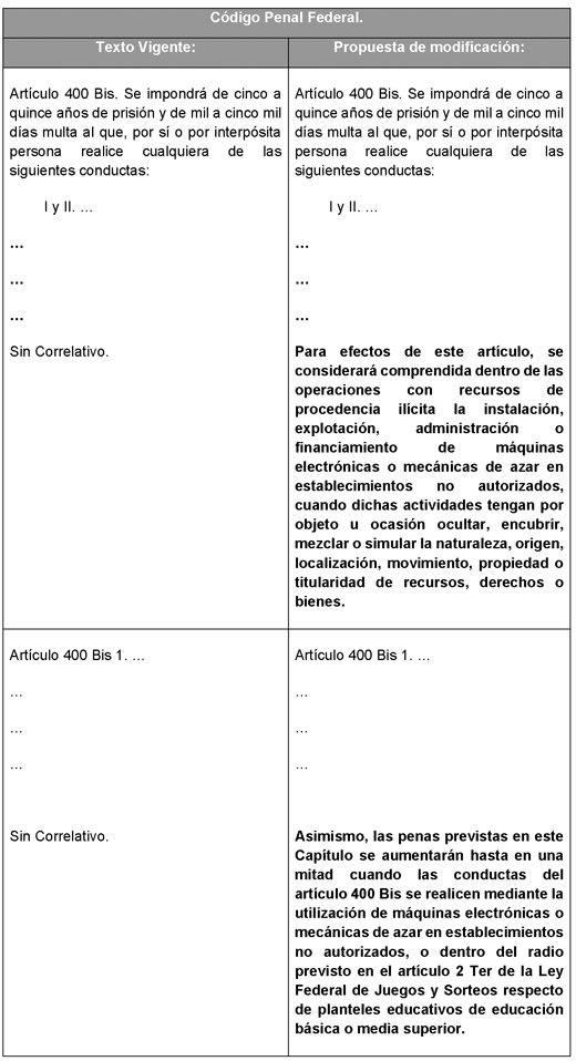 En el marco jurídico penal se propone precisar en el Código Penal Federal que el uso de estas máquinas fuera del régimen de permisos, para ocultar, mezclar o simular recursos, encuadra en operaciones con recursos de procedencia ilícita, de esta manera no se crea un nuevo delito, se aclara una modalidad.