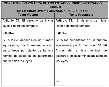 Por lo anteriormente expuesto a continuación, se agrega un cuadro comparativo de la propuesta de reforma al artículo 71 de la Constitución Política de los Estados Unidos Mexicanos: