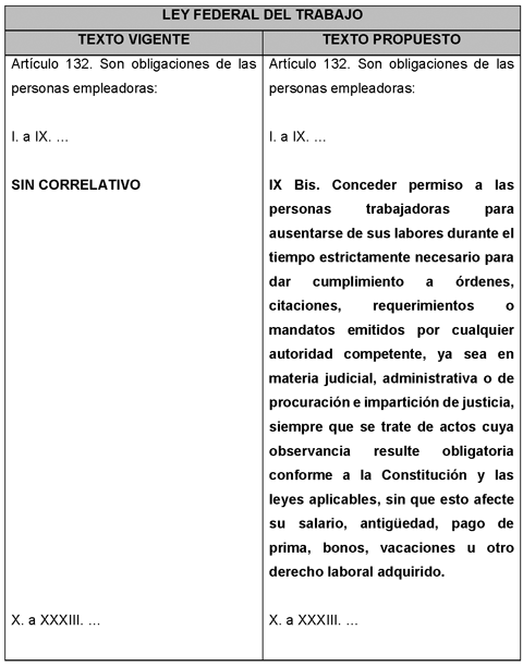 La presente iniciativa propone adicionar una fracción IX Bis al artículo 132 de la Ley Federal del Trabajo, a fin de conceder permiso a las personas trabajadoras para ausentarse de sus labores durante el tiempo estrictamente necesario para dar cumplimiento a órdenes, citaciones, requerimientos o mandatos emitidos por cualquier autoridad competente, ya sea en materia judicial, administrativa o de procuración de justicia, siempre que se trate de actos cuya observancia resulte obligatoria conforme a la Constitución y las leyes aplicables, sin que esto afecte su salario, antigüedad, pago de prima, bonos, vacaciones u otro derecho laboral adquirido.