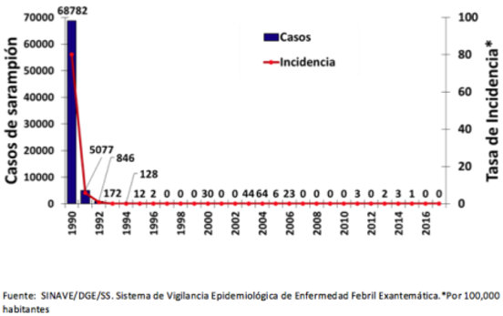 El país ha presentado epidemias de sarampión desde el siglo pasado, siendo el último brote importante en 1989-1990 donde se contabilizaron 89,163 casos. Esto llevó a intensificar las acciones de prevención con la vacuna monovalente antisarampión, logrando para 1996 la eliminación de la transmisión autóctona en el país.5 En el periodo de 1997 a 1999 se realizó la sustitución por la vacuna triple viral (SRP) y durante este periodo se reportó que no hubo casos de sarampión.6