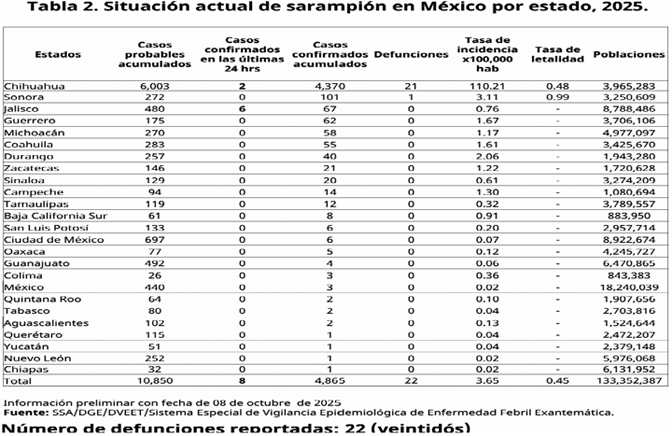 En el informe diario del brote de sarampión en México al 8 de octubre del presente año se han reportado 4,865 casos confirmados de sarampión acumulados distribuidos en 25 entidades de la República y 122 municipios del país.9