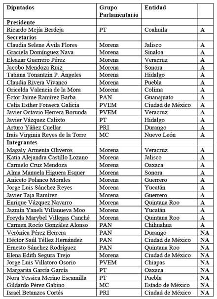 Diputados: Maiella Martha Gabriela Gómez Maldonado, Erubiel Lorenzo Alonso Que, Ariadna Barrera Vázquez, Gabriela Benavides Cobos, Gilberto Daniel Castillo García, Margarita García García, Sandra Beatriz González Pérez, Theodoros Kalionchiz de la Fuente, Patricia Mercado Castro, Petra Romero Gómez, Mirna María de la Luz Rubio Sánchez, Delhi Miroslava Shember Domínguez, Yericó Abramo Masso, Manuel de Jesús Baldenebro Arredondo, Ana María Balderas Trejo, Mario Miguel Carrillo Cubillas, Eduardo Castillo López, Francisco Adrián Castillo Morales, Napoleón Gómez Urrutia, Pedro Miguel Haces Barba, Genoveva Huerta Villegas, Karina Isabel Martínez Montaño, Fernando Mendoza Arce, Daniel Murguía Lardizábal, Ana Karina Rojo Pimentel, Jesús Valdés Peña.