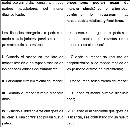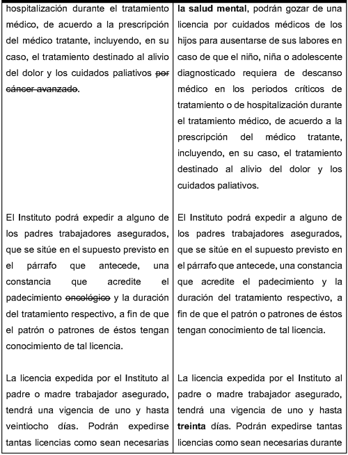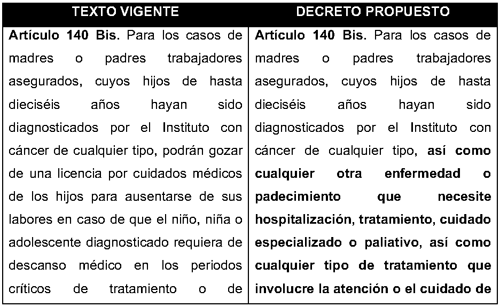 Artículo 140 Bis. Para los casos de madres o padres trabajadores asegurados, cuyos hijos de hasta dieciséis años hayan sido diagnosticados por el Instituto con cáncer de cualquier tipo, así como cualquier otra enfermedad o padecimiento que necesite hospitalización, tratamiento, cuidado especializado o paliativo, así como cualquier tipo de tratamiento que involucre la atención o el cuidado de la salud mental , podrán gozar de una licencia por cuidados médicos de los hijos para ausentarse de sus labores en caso de que el niño, niña o adolescente diagnosticado requiera de descanso médico en los periodos críticos de tratamiento o de hospitalización durante el tratamiento médico, de acuerdo a la prescripción del médico tratante, incluyendo, en su caso, el tratamiento destinado al alivio del dolor y los cuidados paliativos.