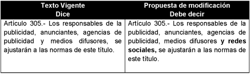 Es por ello que, mediante la presente iniciativa, porpongo que, dentro del artículo 305 de la Ley, se incluya a las redes sociales en el cumplimiento de los preceptos en materia de publicidad que la Ley General de Salud establece.