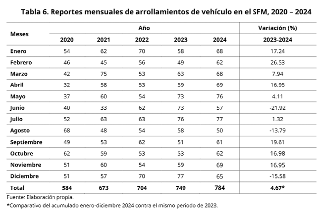 Casos como el que lamentablemente sucedió en días pasados en el Estado de México, con la consecuente pérdida de vidas humanas, obliga a la Secretaría del ramo a revisar sus protocolos de verificación y supervisión, así como sus acciones para el cumplimiento de las normas en la materia, en un contexto en donde los siniestros en los cruces de nivel pasaron de 584 en el año 2020 a 784 en el año 2024,4 lo que representa un llamado de atención para las autoridades, esta tendencia al alza, como se muestra en la gráfica de la Autoridad Reguladora del Transporte Ferroviario.