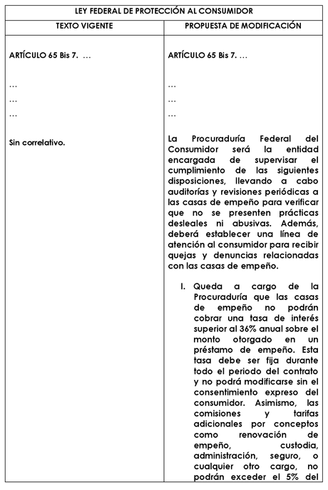 Decreto por el que se adiciona un párrafo quinto y uno sexto al artículo 65 Bis 7 de la Ley Federal de Protección al Consumidor, en materia de casas de empeño