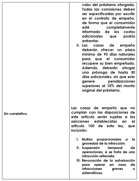 Las casas de empeño que no cumplan con las disposiciones de este artículo serán sujetas a las sanciones establecidas en el artículo 100 de esta ley, que incluirán: