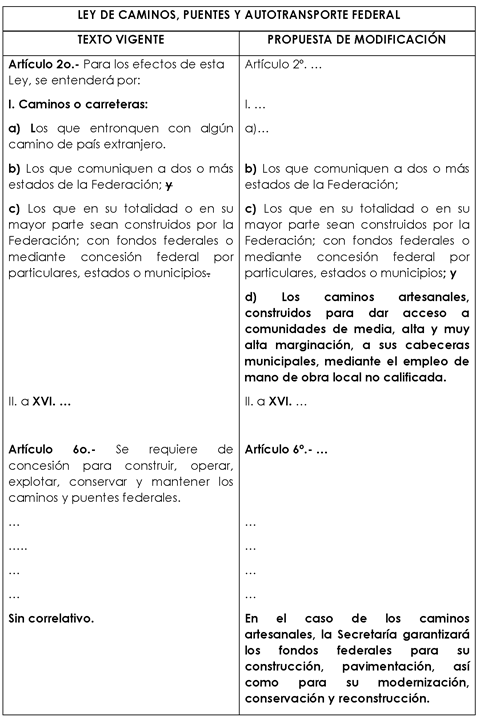 De esta manera, estamos planteando una reforma a los artículos 2o. y 6o. de la Ley de Caminos, Puentes y Autotransporte Federal con el propósito de reconocer los caminos artesanales y garantizar su plena ejecución.