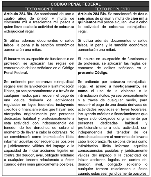 Es bajo este contexto, que se hace evidente la necesidad de establecer una mayor sanción para estas actividades, al igual que tipificar el Acoso u Hostigamiento en el Código Penal Federal, toda vez que, si bien existen actualmente normas y disposiciones orientadas a garantizar una cobranza justa y ética, como lo son la Ley para la Transparencia y Ordenamiento de los Servicios Financieros, las Disposiciones de Carácter General aplicables a las Entidades Financieras en materia de Despachos de Cobranza, así como el propio Código Penal Federal que se plantea reformar, su aplicación no ha logrado inhibir de manera efectiva este tipo de prácticas.