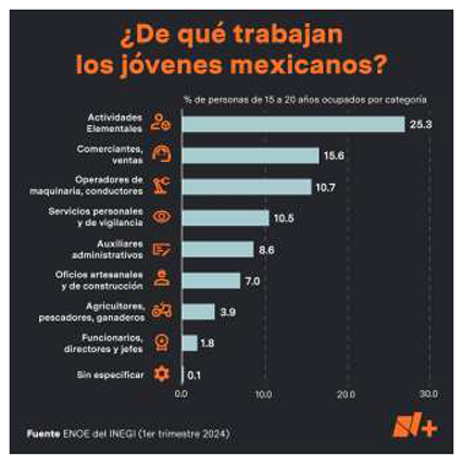 La Encuesta Nacional de Ocupación y Empleo (ENOE), del INEGI, informó que en México hay 15.9 millones de jóvenes de entre 15 y 29 años que trabajan. El 60.3 por ciento son hombres, y el 39.7 por ciento son mujeres. Según los datos revelados, el 25.3 por ciento realiza actividades elementales. El 16.5 por ciento son profesionistas y técnicos, mientras que el 15.6 por ciento son comerciantes o se dedican a las ventas.