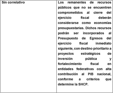 Los remanentes de recursos públicos que no se encuentren comprometidos al cierre del ejercicio fiscal deberán considerarse como economías presupuestarias. Dichos recursos podrán ser incorporados al Presupuesto de Egresos de la Federación del ejercicio fiscal inmediato siguiente, con destino prioritario a proyectos estratégicos de inversión pública y fortalecimiento fiscal en entidades federativas con alta contribución al producto interno bruto nacional, conforme a criterios que determine la Secretaría de Hacienda y Crédito Público.