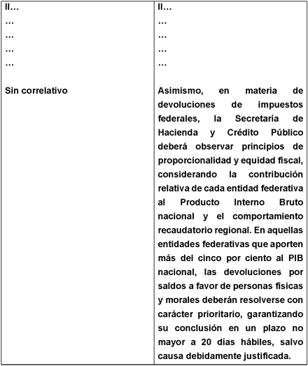 Asimismo, en materia de devoluciones de impuestos federales, la Secretaría de Hacienda y Crédito Público deberá observar principios de proporcionalidad y equidad fiscal, considerando la contribución relativa de cada entidad federativa al producto interno bruto nacional y el comportamiento recaudatorio regional. En aquellas entidades federativas que aporten más del cinco por ciento al producto interno bruto nacional, las devoluciones por saldos a favor de personas físicas y morales deberán resolverse con carácter prioritario, garantizando su conclusión en un plazo no mayor a 20 días hábiles, salvo causa debidamente justificada.