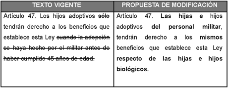 No obstante, los casos de adopción no están considerados para las fuerzas armadas. Asimismo, la Ley en comento presenta una vulneración a los derechos humanos en igualdad de condiciones y de no discriminación, pues el artículo 47 establece que las hijas e hijos adoptivos gozarán de los beneficis que marca la Ley siempre y cuando el proceso de adopción se haya hecho por el personal militar antes de haber cumplido los 45 años de edad.